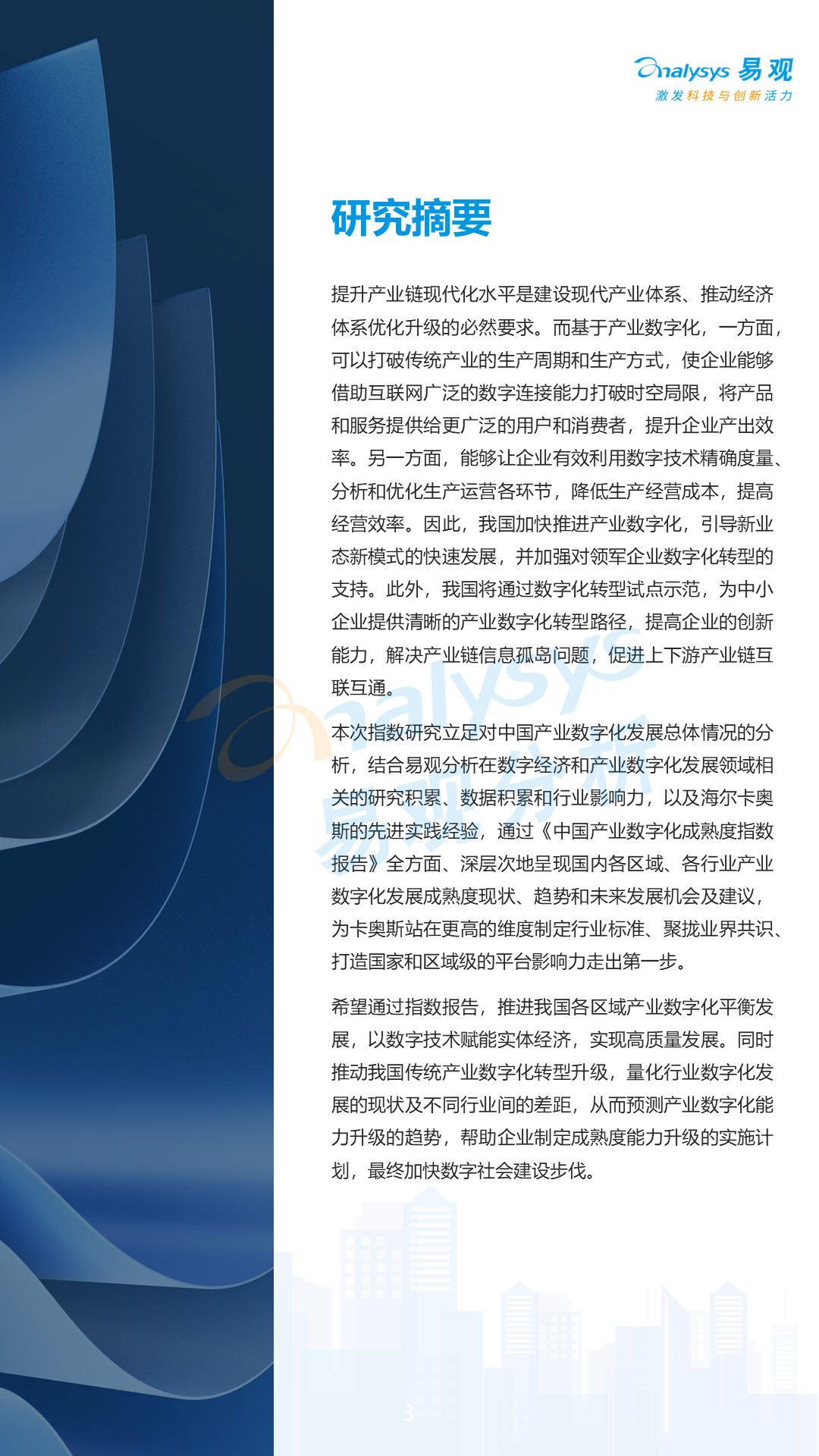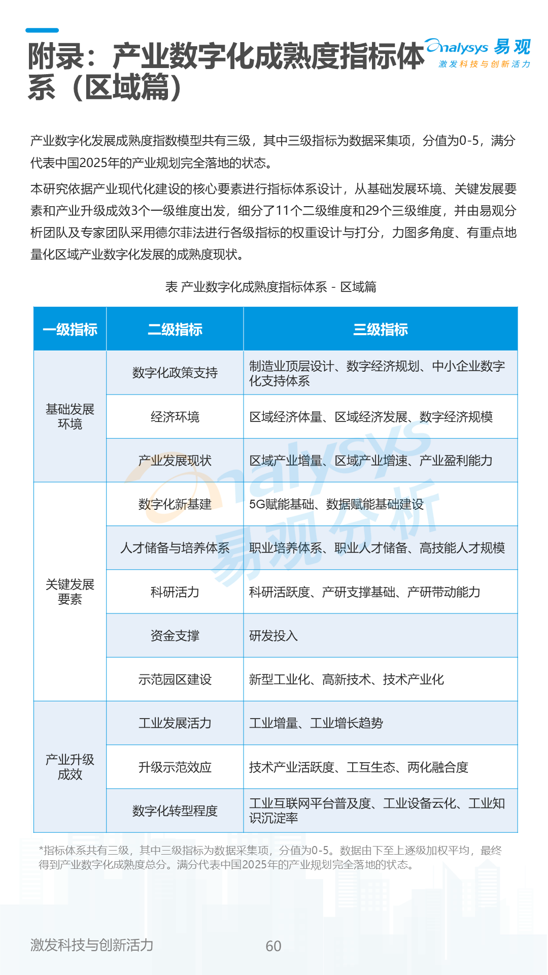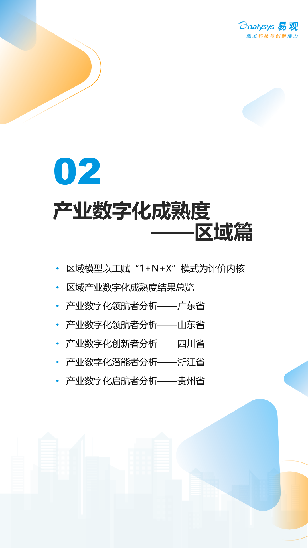产业数字化发展成熟度指数旨在度量中国主要区域与行业产业数字化发展现状以及核心关键要素,从而剖析国家主要区域的“十四五规划”与产业数字化发展方向,为社会经济高质量发展提供方向性指引。