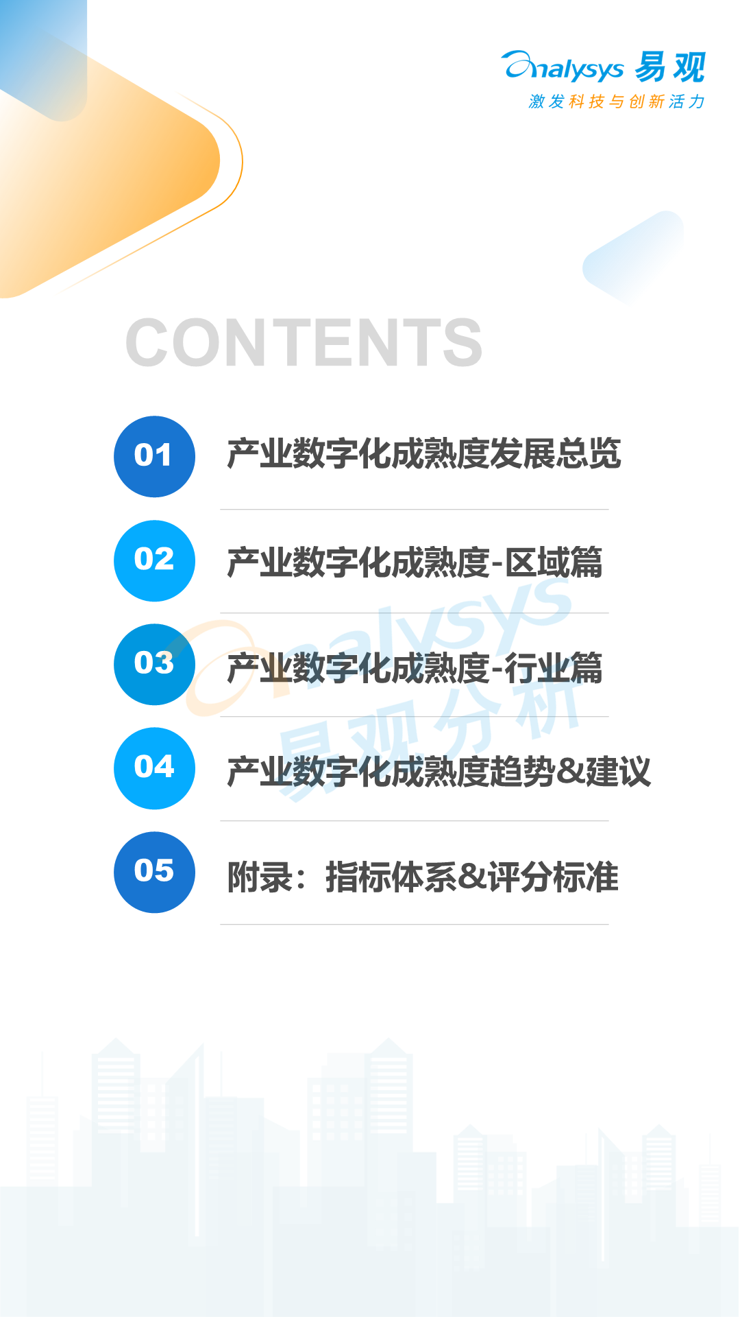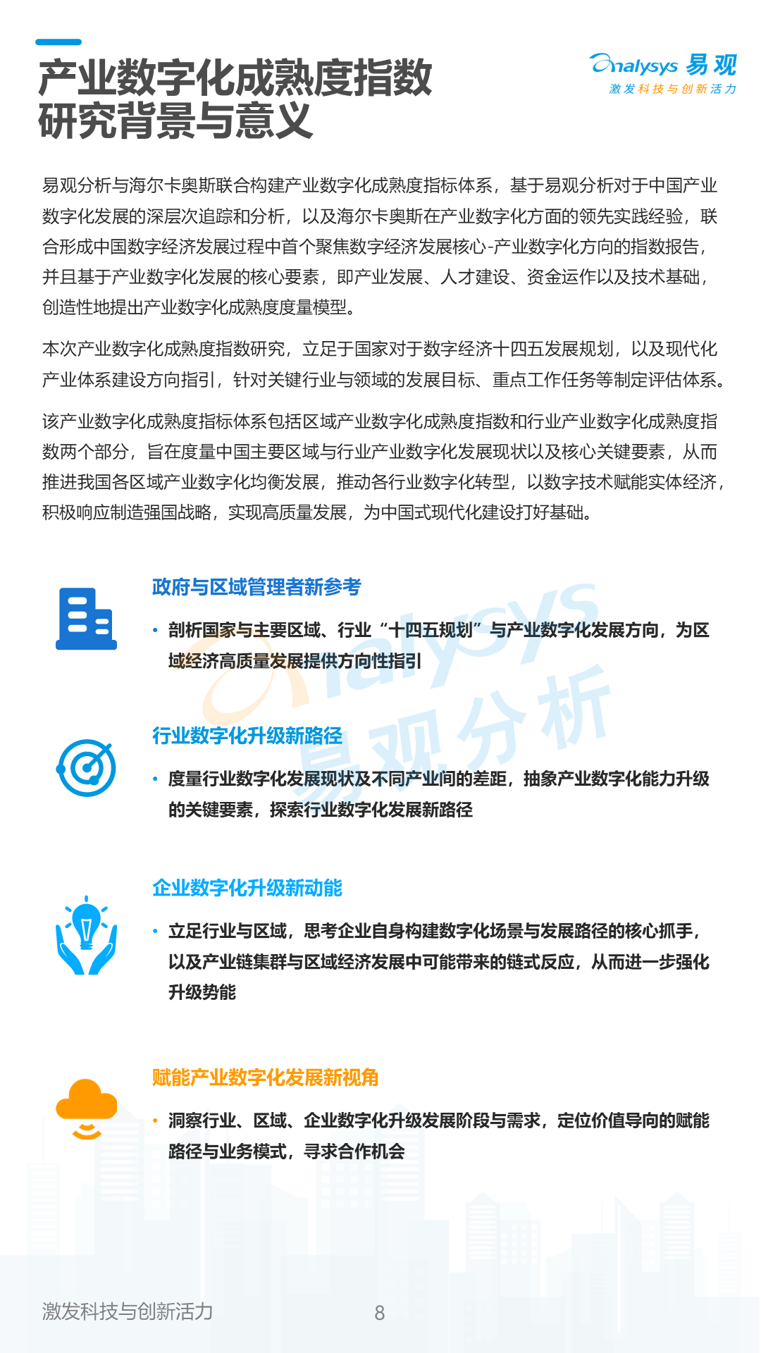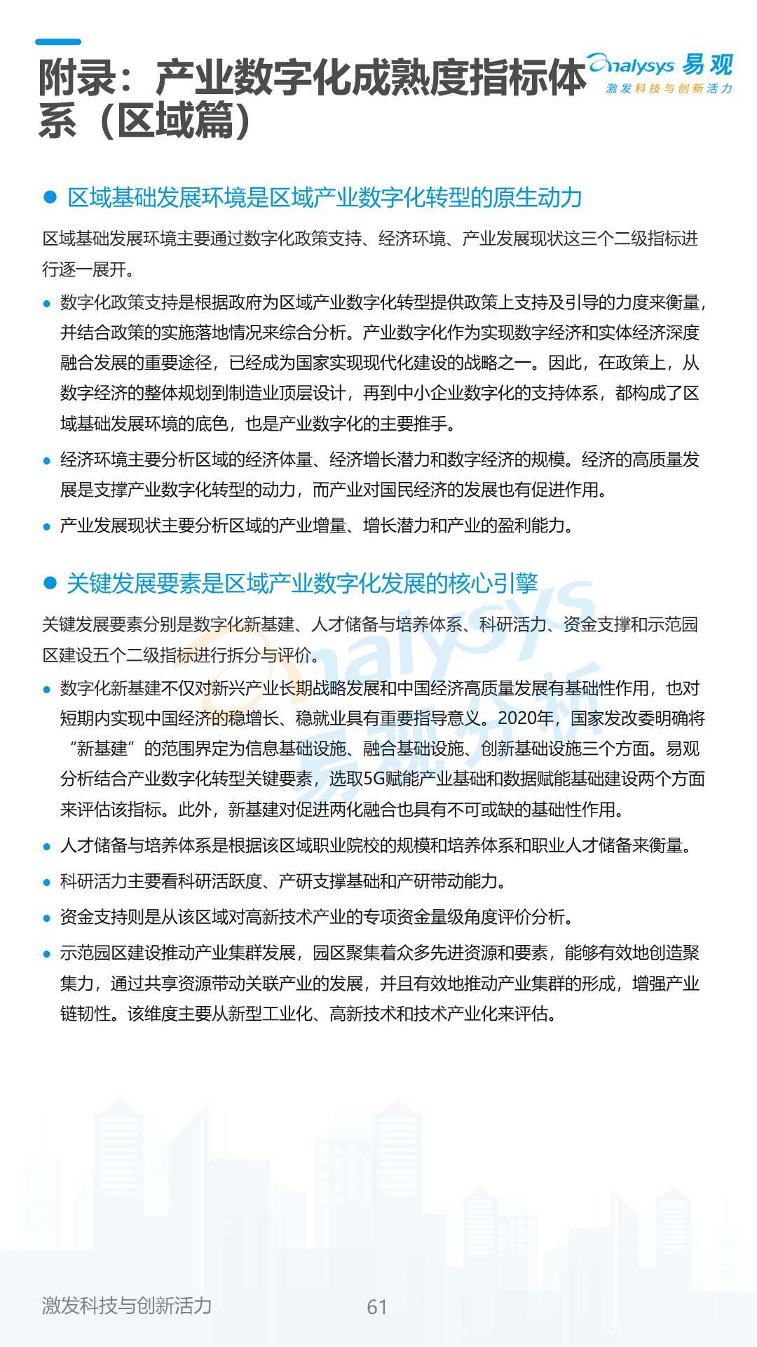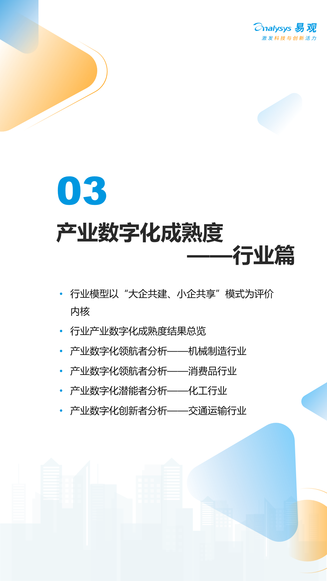 产业数字化发展成熟度指数旨在度量中国主要区域与行业产业数字化发展现状以及核心关键要素,从而剖析国家主要区域的“十四五规划”与产业数字化发展方向,为社会经济高质量发展提供方向性指引。