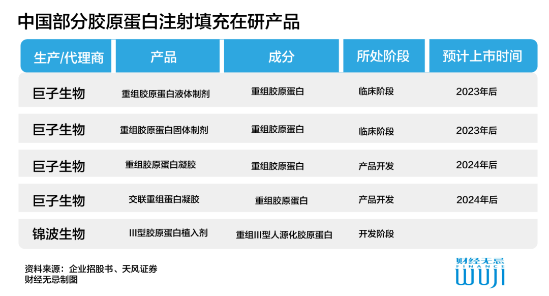 另一方面,在胶原蛋白注射领域,巨子生物相关产品也进入产品开发或临床阶段,但并不具备先发优势。目前国内已经上市的第III类胶原注射产品主要竞争公司有4家,分别为中国台湾双美、长春博泰、荷兰汉福和锦波生物。