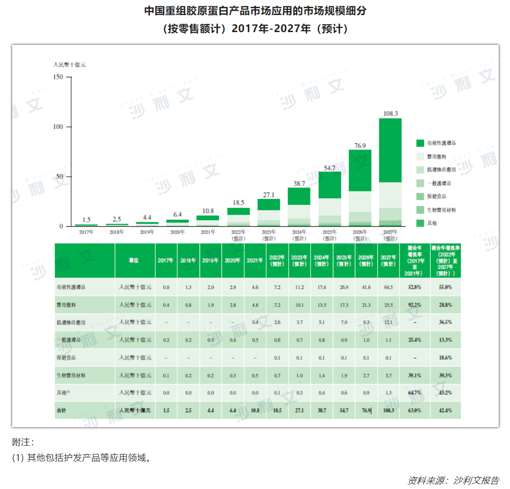 参考弗若斯特沙利文给出的数据,2021年,在中国胶原蛋白产品市场中,重组胶原蛋白产品规模占比接近40%,且占比或将持续提升。预计到2027年,中国重组胶原蛋白产品规模有望达到1083亿元。