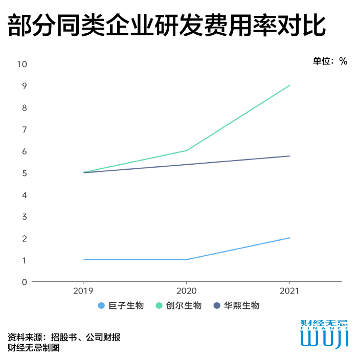 除了关键技术的突破外,被称为“美妆界华为”的巨子生物其科技浓度也并不高。2019至2021年,巨子生物的研发开支仅占同期总营收的1.2%、1.1%、1.6%,三年累计研发投入不到5000万元,而华熙生物的研发支出在5%左右,爱美客为7%。同为胶原蛋白行业的创尔生物,2021年研发费用2222万元,研发费率上升为9.25%。