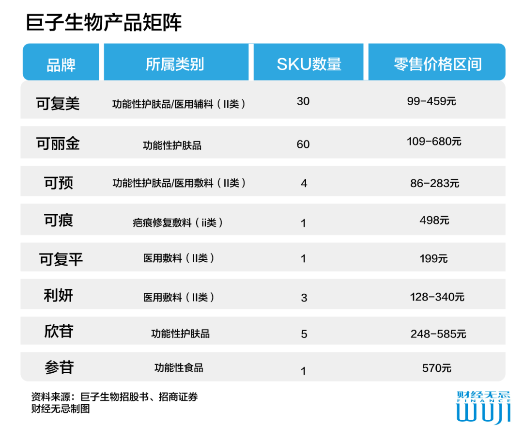 而据财经无忌不完全统计,而据天猫平台数据,创尔生物旗下两大品牌创福康和创尔美的SKU数接近60种左右,远低于巨子生物。