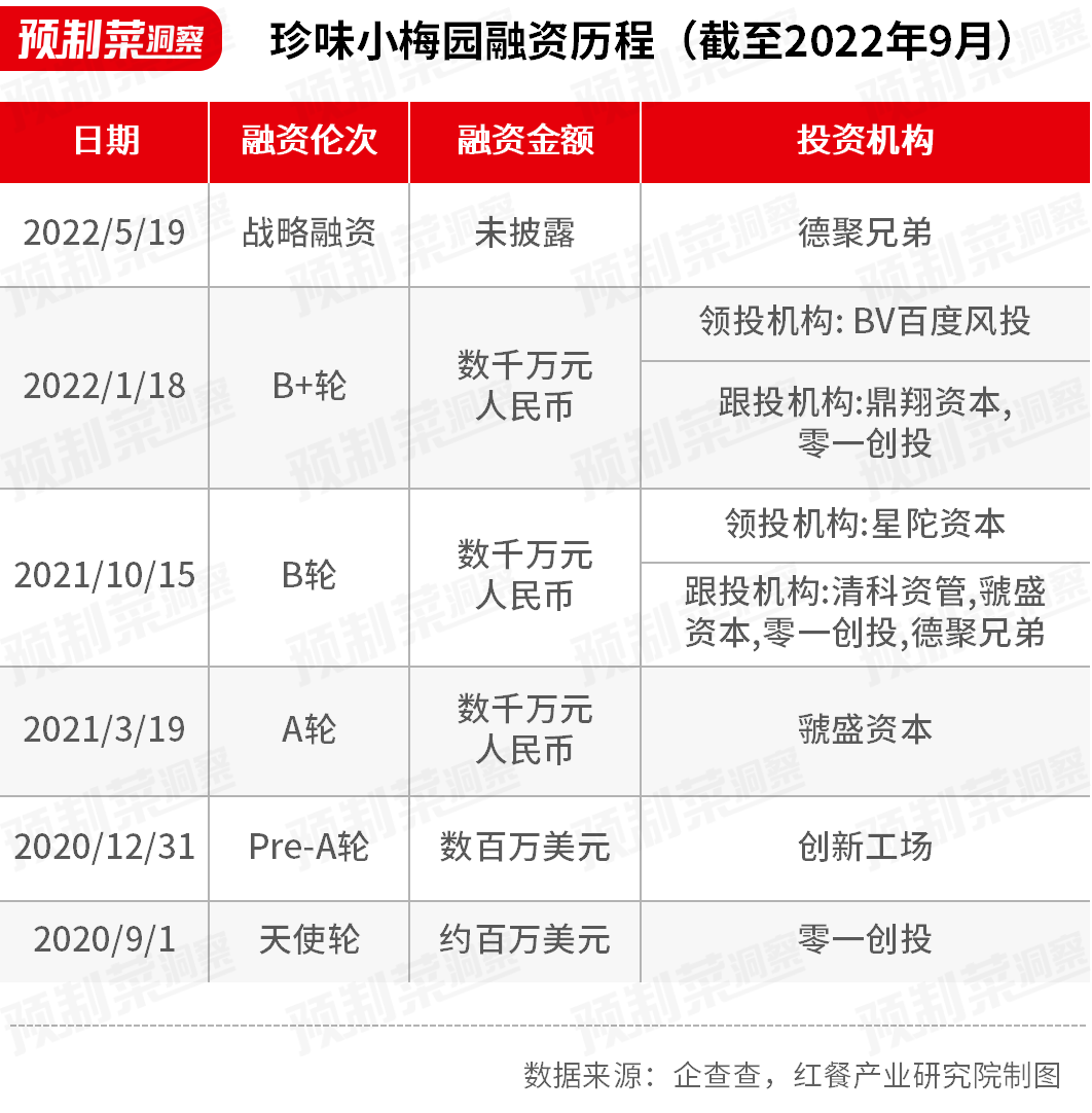 2022年1月,珍味小梅园完成B+轮融资,融资金额达数千万元,该轮投资由百度风投领投,鼎翔资本和零一创投跟投;2022年5月,珍味小梅园再次完成战略融资,融资金额未披露,投资方为德聚兄弟。截至2022年年底,珍味小梅园共已完成6轮融资。