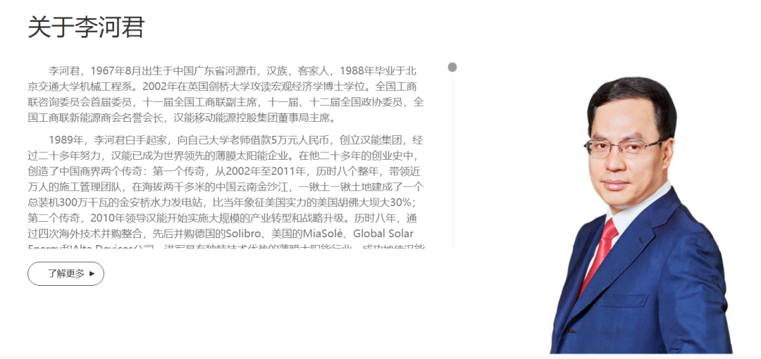 汉能集团官网上,用一句话概括了李河君的创业经历:向自己大学老师借款5万元人民币,创立汉能集团,经过二十多年努力,汉能已成为全球最大的民营水力发电企业和全球最大的薄膜太阳能企业。