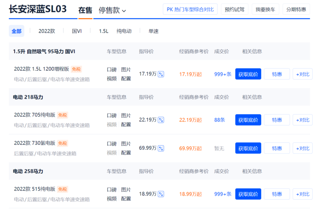 还有一点是销量占比问题。根据第三方汽车网站成交价数据显示,深蓝SL03售价为17.19万元的增程版和售价18.99万元的515纯电版均有999+条成交信息,而售价更高的705纯电版则仅有88条成交信息。