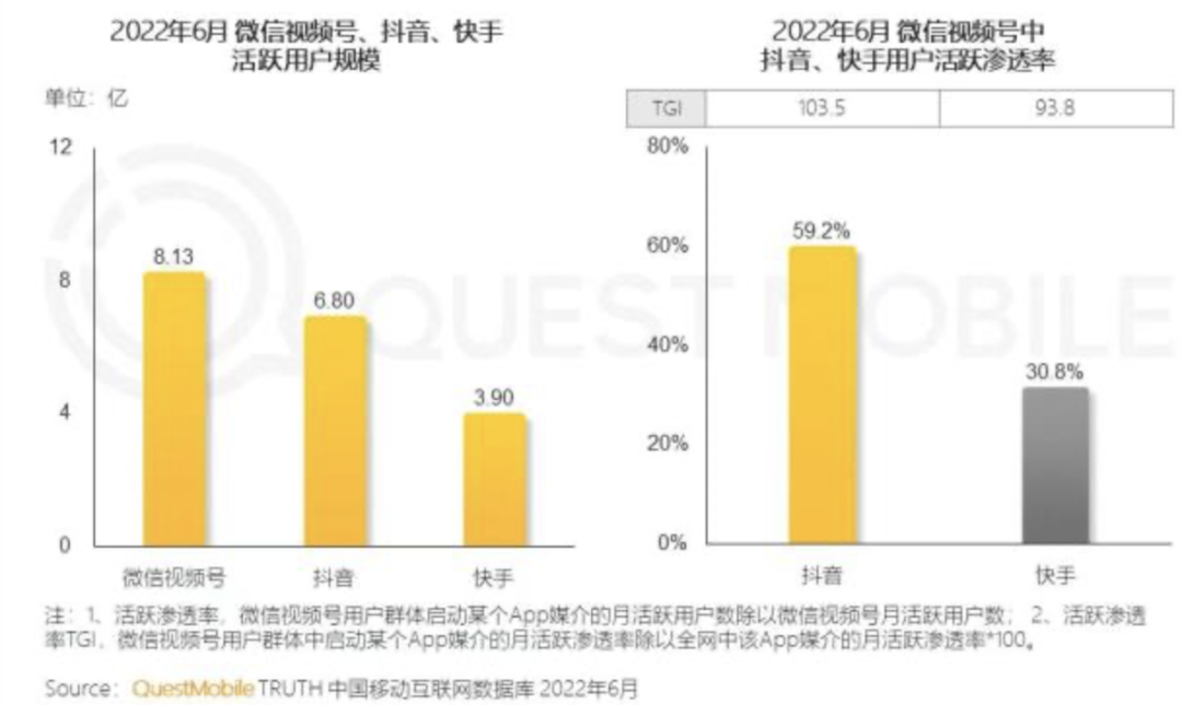 但其还是在微信的生态下成功打开了局面。根据Quest Mobile发布的数据,截至2022年6月,视频号月活用户数量为8.2亿,而近期的渠道调研数据显示,视频号的日活3.64亿。这两个数据已经完全超过了快手。