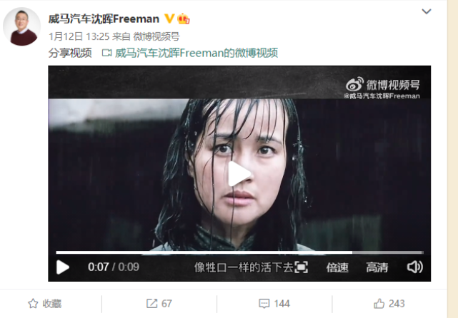 值得关注的是,就在Apollo宣布收购威马的同一天,威马汽车董事长兼CEO、加拿大人沈晖,在微博发布了一段电影《芙蓉镇》的经典片段,其中一句台词为“活下去,像牲口一样的活下去”。