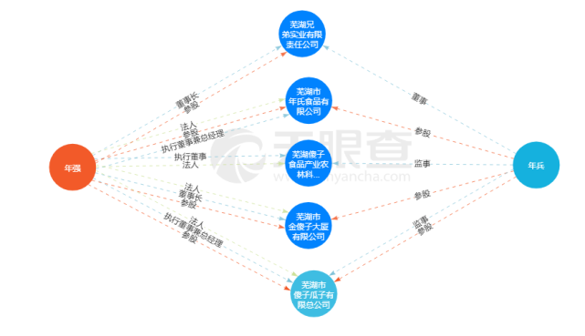 除了芜湖市傻子瓜子有限总公司以外,年强目前所有任职的企业还有12家,如安徽诺福电子商务有限公司、芜湖兄弟实业有限责任公司、芜湖市年氏食品有限公司、芜湖兄弟非融资性担保投资有限公司等。