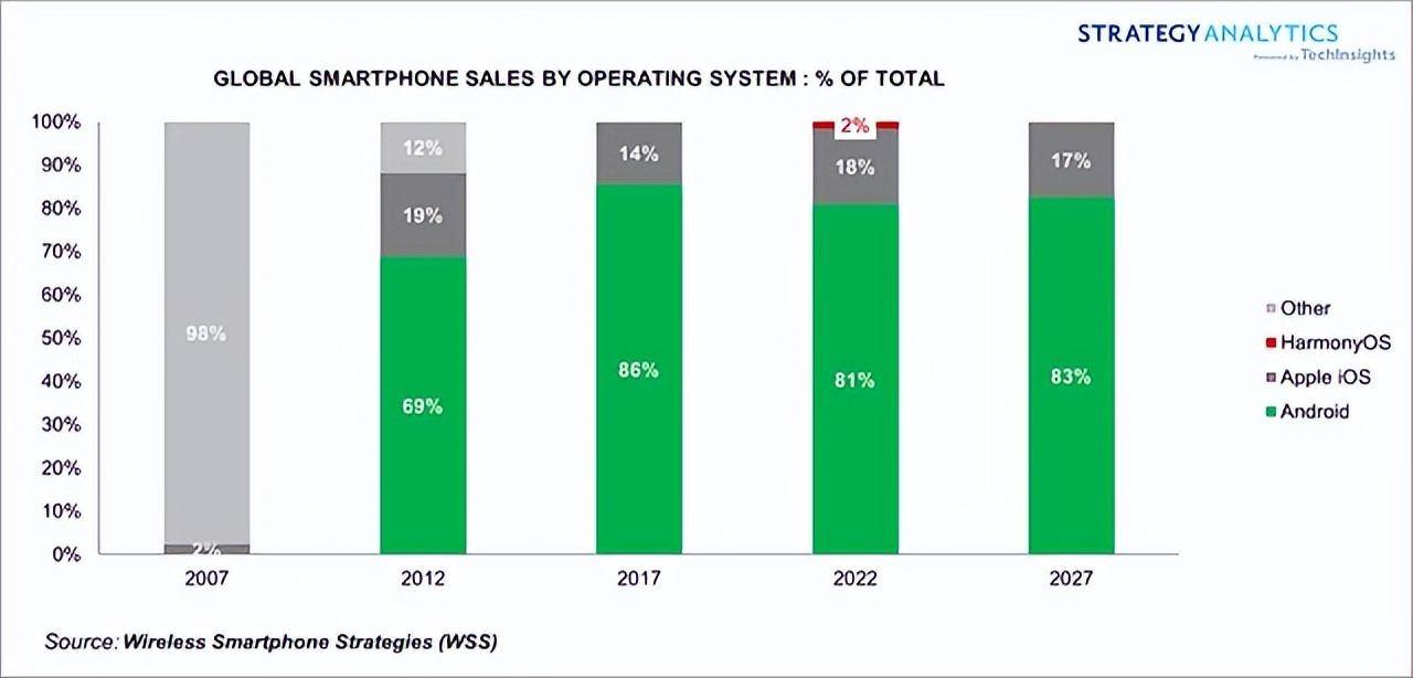 而根据Strategy Analytics机构的预测,到2027年时,鸿蒙系统的份额将变成为0,而对于这种预测,该机构很可能还是基于操作系统的马太效应,对于这种预测,我们不应该嘲笑,对于鸿蒙来说,或许也应该有足够的重视与警惕,并思考破局办法。
