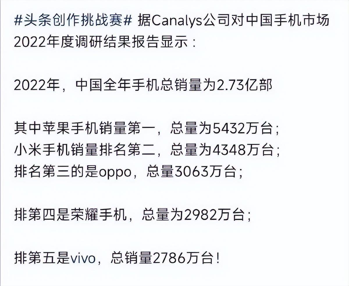 Canalys公司日前发布了对中国手机市场2022年度调研报告,报告显示2022年中国全年手机总销量达2.73亿部,前五名分别为苹果、小米、OPPO、荣耀、vivo,华为不在前五之列。