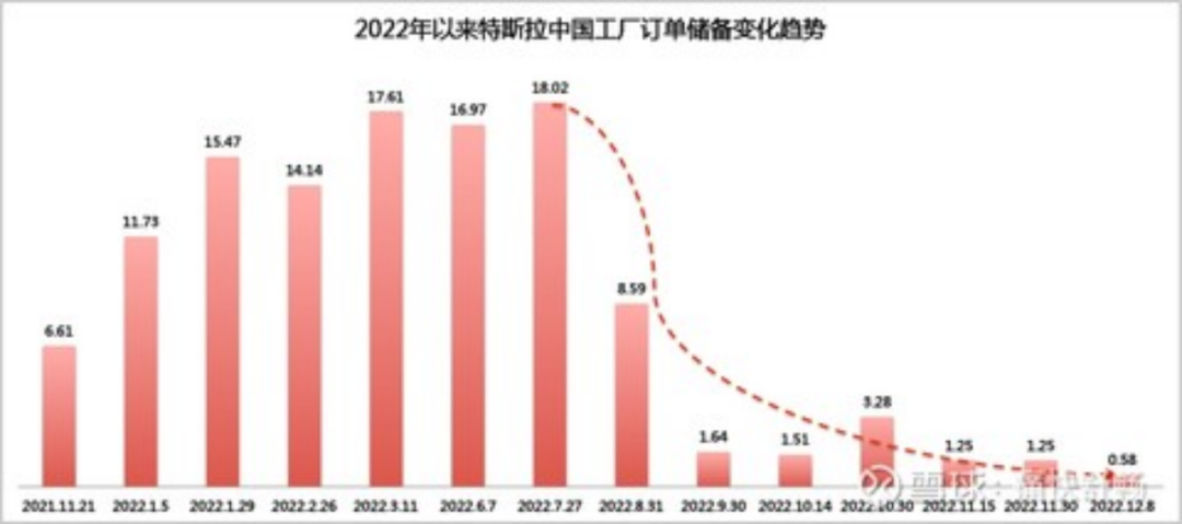 从2022年7月以来,特斯拉中国工厂的储备订单量开始急剧下滑,从7月的18.02万张一路下滑至11月底的0.58万张。2022年全年特斯拉产量超137万辆,同比增长47%;交付量超131万辆,同比增长40%,但未能达成交付量同比增长50%的目标(137万辆)。