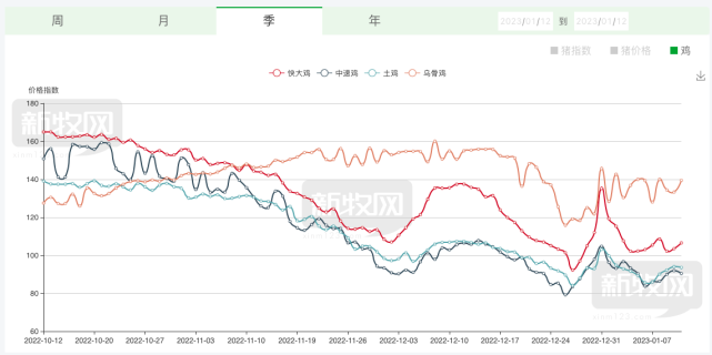 根据新牧网数据,快大鸡和中速鸡在去年11月底跌破成本线,即使在今年1月后逐步回升,依然在成本线下徘徊。截至1月11日,快大鸡全国均价5.49元/斤,中速鸡5.62元/斤,土鸡7.33元/斤,乌骨鸡8.45元/斤。