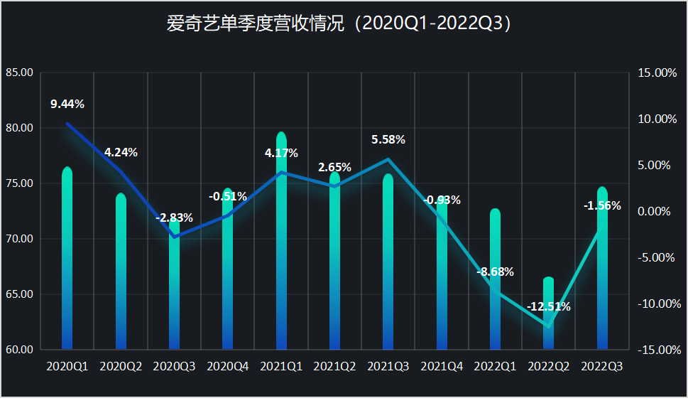 自2021年四季度以来,爱奇艺已多个季度营收倒退。去年11月22日,爱奇艺发布了三季度财报,单季度营收75亿元,同比下滑2%,调整后净利润1.87亿元。