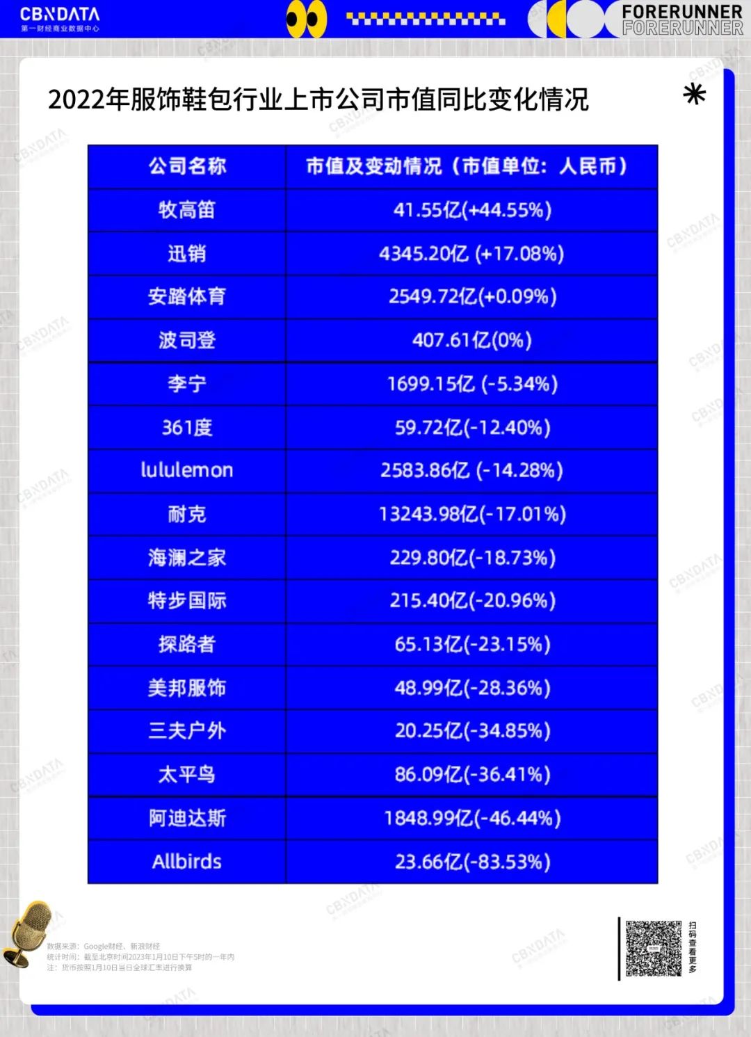 如何通过公司变化角度回看消费行业的2022?或许各上市消费企业的市值变动能说明一些问题。CBNData从2022年福布斯企业排名TOP500中筛选出了6大To C消费行业的相关公司,连同国内外部分明星上市消费公司一起做了对比,借此还原2022年资本市场对行业的态度。此外,CBNData对其中市值涨跌幅较大的重点公司进行了简单分析,希望通过这些公司寻找消费持续复苏下的微光。