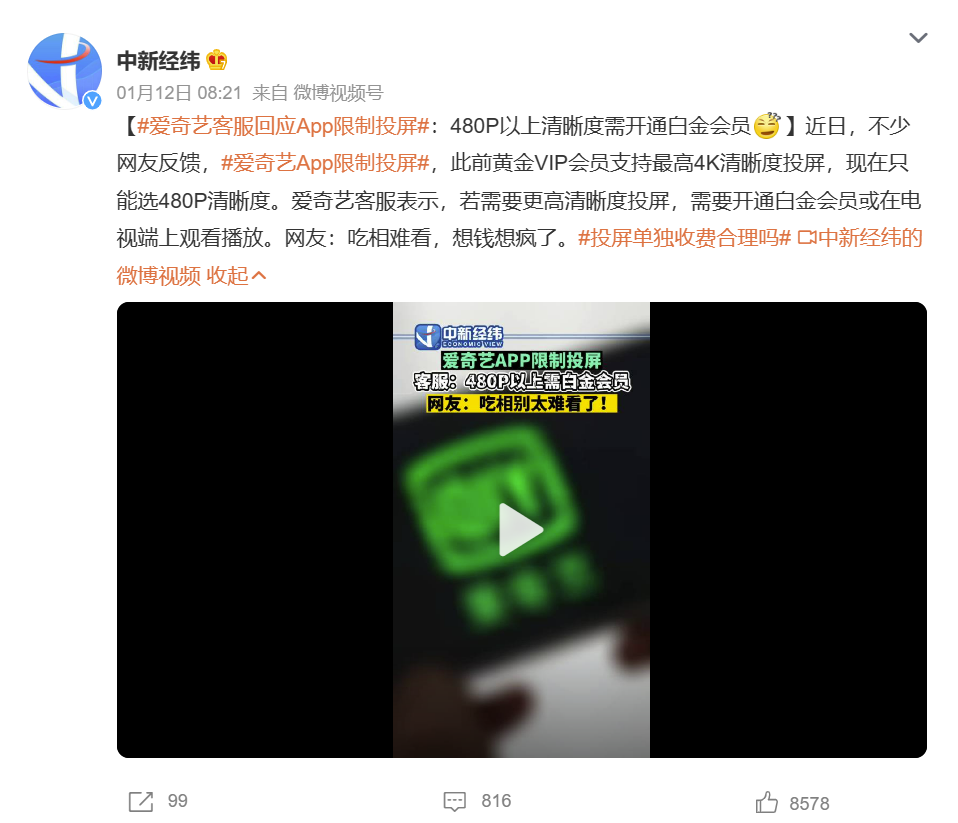 前些天,一些网友发现爱奇艺在移动 App 端对投屏做了限制,原本爱奇艺黄金 VIP 会员支持 4K 清晰度视频投屏,现在就算是黄金 VIP 也只支持 480P 清晰度的投屏。后续爱奇艺客服回应称,黄金会员可以在电脑、平板和手机端使用,同时可以使用 480P 清晰度进行投屏。