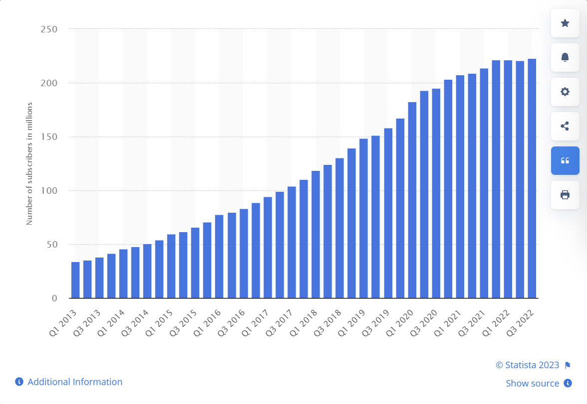 Netflix 作为流媒体模式的最佳代表,很长时间都受到用户和市场的追捧。其商业模式很简单,核心收入就是用户订阅收入,只与「订阅价格」和「订阅用户数」直接相关,但前者不能随意调高,后者则是 Netflix 保持多年高速增长的关键。