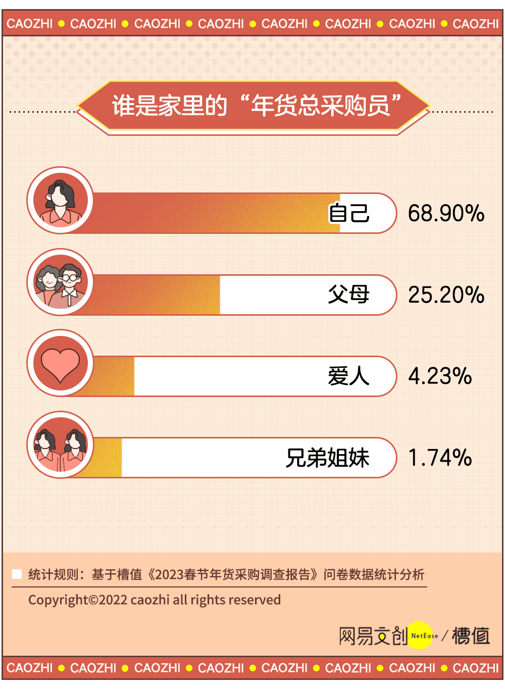 尽管他们中多数是刚参加工作的社会新人、在校学生,但已有76%的00后参与了年货采购,更有7%的00后表示:家里年货我全权负责。