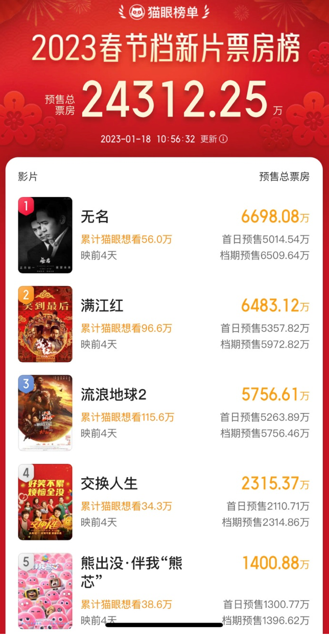 硬糖君原本以为,这不是板上钉钉的《流浪地球2》领跑“一超多强”格局吗。结果预售一开,对不起,是我不懂春节档了。宣发数据与声量靠后的《无名》强势领跑,超级巨头《流浪地球2》预售被甩在第三名,甚至落后于第二名的《满江红》一大截。