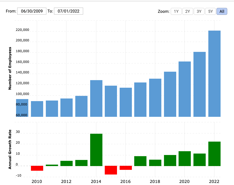 不过,即便是进行了大规模裁员,这些科技公司的员工总数依然明显高于2021年的水平。换句话说,科技公司现在的裁员只是抹去了过去一年扩招的一部分员工,大部分企业裁员之后的员工总数依然高于2021年底的数字。