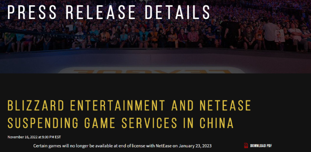 2022年11月17日,暴雪娱乐突然发布了一则公告,宣布结束与网易的代理合作,旗下所有游戏(除手游《暗黑破坏神:不朽》外)的中国大陆地区服务器将于2023年1月23日关闭。新的合作伙伴何时出现,直到现在也没有回音。