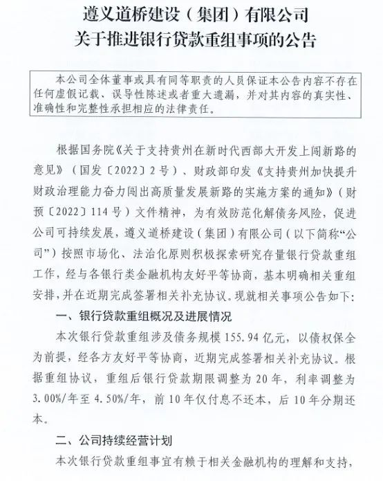 遵义道桥债务展期20年,银行这次可是亏大了
