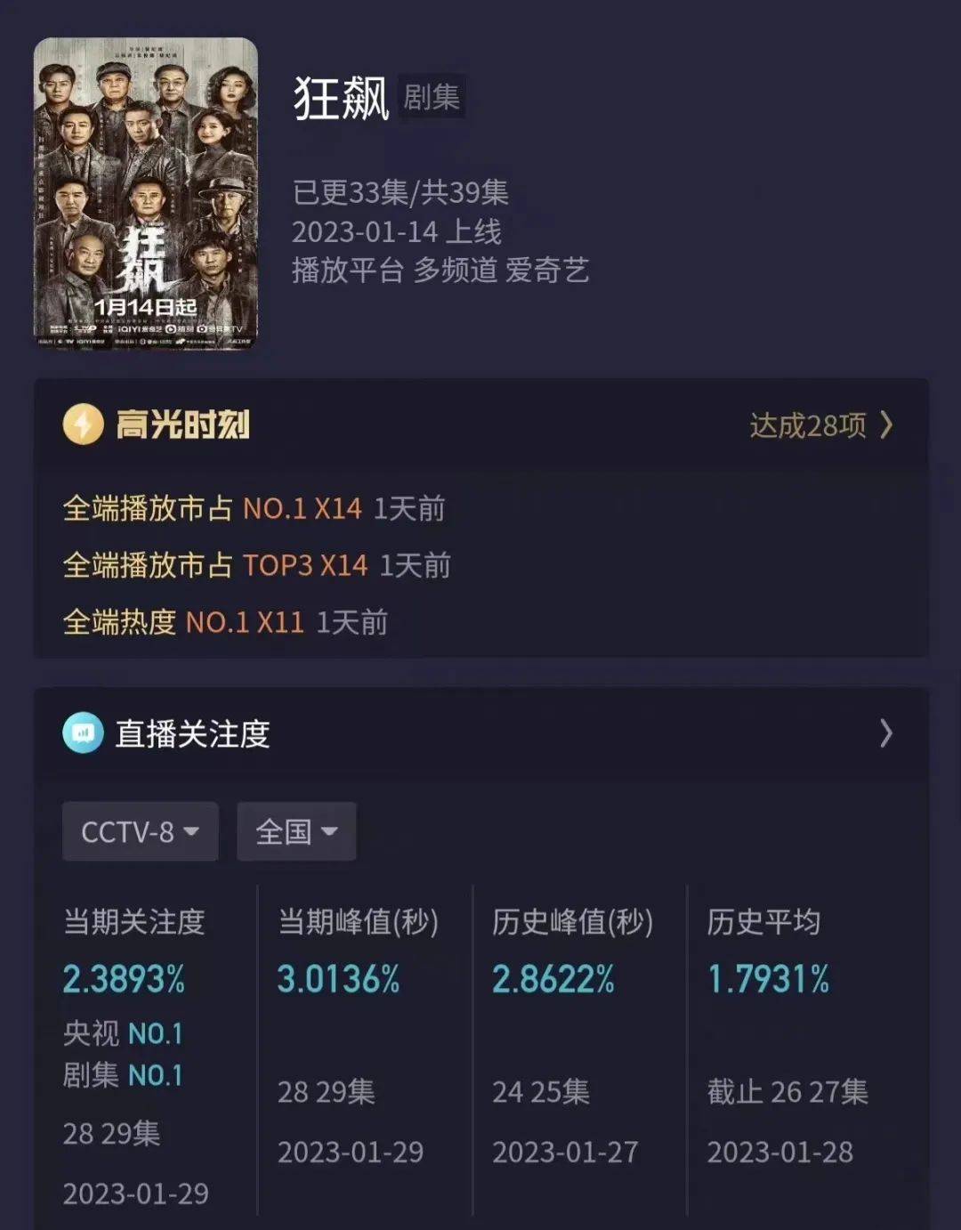 几个数据证明。从播放来看,爱奇艺站内热度值首次破11000,这个数据表现超越了此前所有“破万”爆款剧成为新纪录;根据灯塔专业版数据,该剧最高正片播放市占率超30%,春节假期稳定在25%以上,同期剧集里表现最好的《三体》为12%。