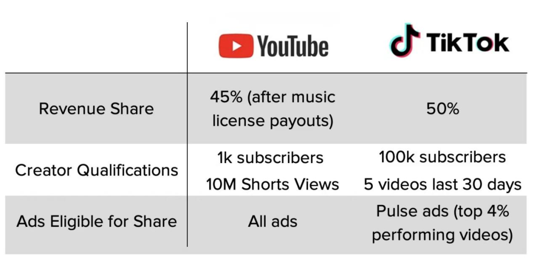 YouTube 与 TikTok 对创作者的广告分成政策对比 | 来源:Twitter