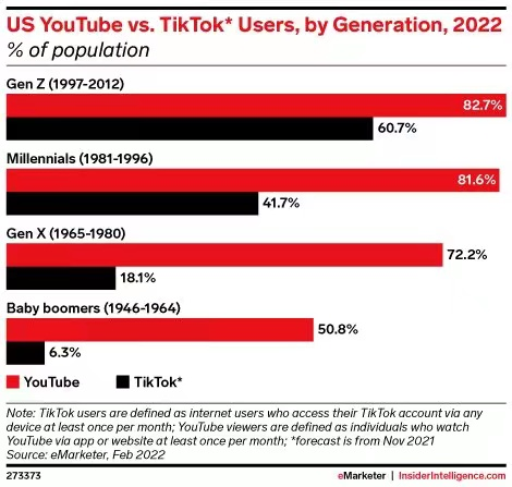 更“严重”的是,据 eMarketer 2022 年数据,2021 年,在 Z 世代中使用 YouTube 的用户占比 82.7%,而使用 TikTok 的用户占比为 60.7%,和 YouTube 实际有不小的差距。另据 pewresearch 统计,年轻群体中使用 YouTube 的频率也要整体比 TikTok 高。所以整体来看,YouTube 在 Z 世代中的渗透程度仍然强于 TikTok,YouTube 在传统视频领域多年的积累不容小觑,再加上 YouTube 现在发力短视频,对 TikTok 的威胁更加明显。