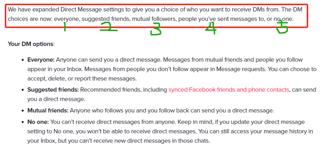 据 The Information 1 月 25 日消息,TikTok 正在通过邮件通知用户,App 内 DM(direct message 私信)的设置权限被扩大了。其实,这项设置权限在 2022 年 11 月就已经低调更改,更改之前,用户只能接收来自互关好友以及被推荐过的用户(Facebook、手机通讯录联系人)的私信,更改之后的权限下,用户有了 5 种选项,分别是所有人、被推荐过的用户、共同关注人(用户关注的/关注用户的人)、自己先发送过私信的用户以及谁都不行。