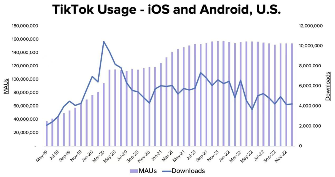 据统计,截至 2023 年 1 月 28 日,美国大约有 3.35 亿人口,而 TikTok 的月活有 1.4 亿,甚至超过美国人口的 1/3,结合这个用户基数,TikTok 的下载量和 MAU 可能已经接近了天花板。