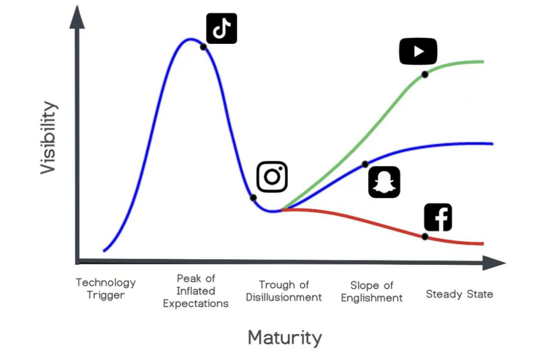TikTok 成立时间最晚,还处在高峰期,但按照规律来讲,紧接着很可能会经历市场期望的“泡沫”破裂的阶段。要想实现第二次增长,现在思考出路一点都不早。