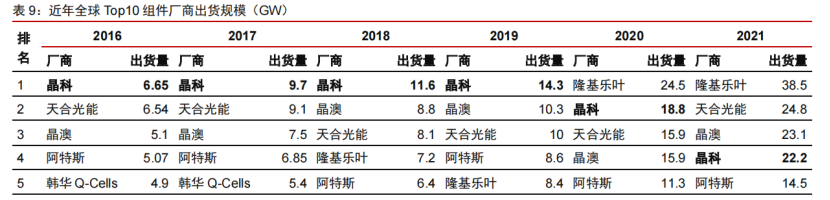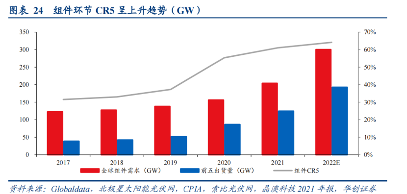 其次,从组件环节集中度来看,近年来呈现逐年上升趋势。根据统计,2021年前五家组件企业合计出货124.6GW,约占全球组件需求的61.1%,同比+5.7pct;预计2022年CR5为60%-68%。