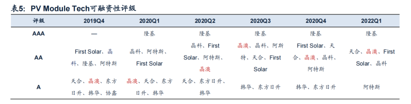 衡量厂商海外竞争力的一个核心指标便是可融资性评级。现阶段,面对错综复杂的国际形势,海外开发商在进行采购的同时需要衡量风险,选择评级较高的组件厂商意味着可以从银行获取较低的贷款利率,将风险转嫁,使得自身承担的风险最小。因此,可融资性评级越高的企业,与外国光伏电站开发商合作的可能性越大。
