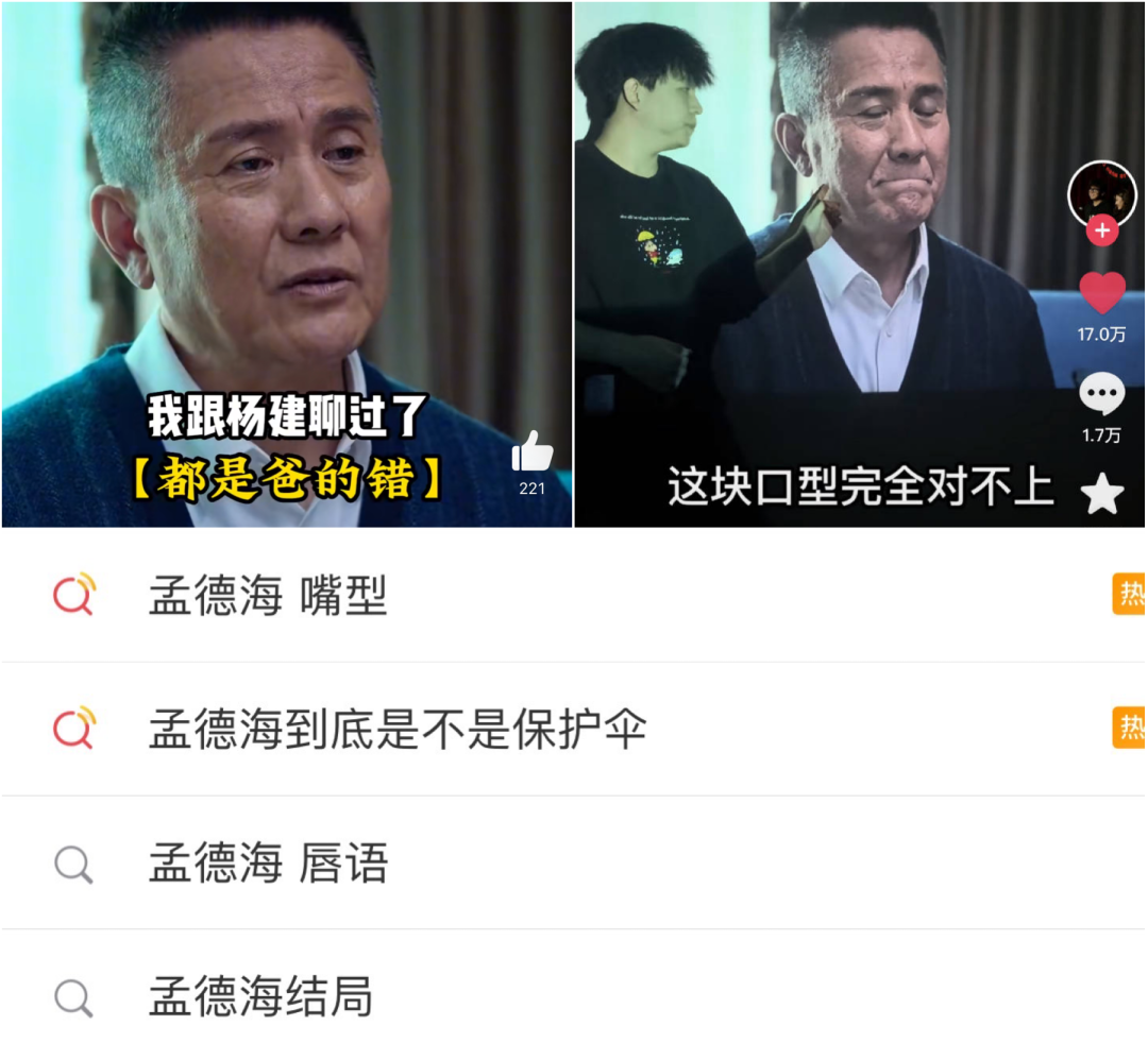 没有赢得认可,不会有这样的热度和分数。观众的偏爱,甚至能让其自行拼凑拼图,试图拼出一个被过滤之前的故事。《狂飙》播出到2021年时间线时,有观众发现剧中关键人物,安欣的养父之一、时任京海市人大常委会主任的孟德海嘴型对不上台词,“孟德海 嘴型”就登上了微博热搜,有网友还根据唇语推测出了新的剧情走向。