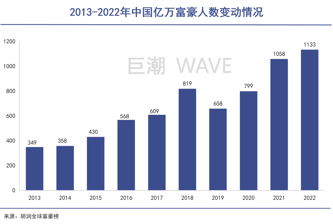 2021年,《胡润百富2021中国高净值人群家族安全报告》显示,中国拥有600万人民币家庭净资产的“富裕家庭”数量已达501万户;拥有千万人民币家庭净资产的“高净值家庭”有202万户;拥有亿元人民币家庭净资产的“超高净值家庭”数量达到13万户;拥有亿元人民币可投资资产的“超高净值家庭”有7.7万户;拥有3000万美元可投资资产的“国际超高净值家庭”数量达到5.4万户。
