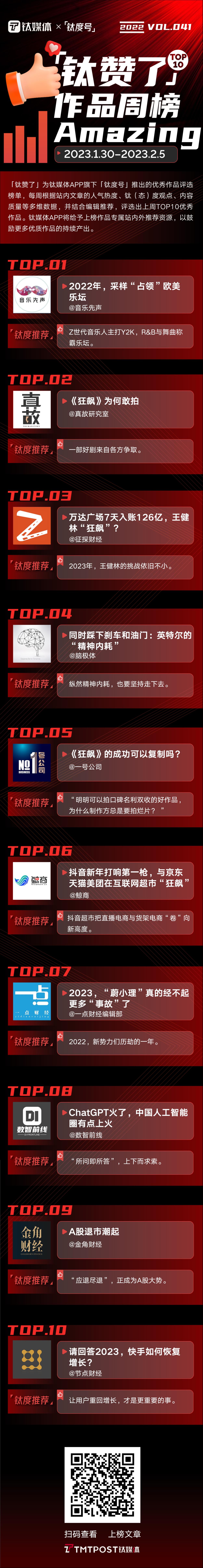 2023年1月30日—2023年2月5日,「钛赞了」榜单第41期上榜作品为: