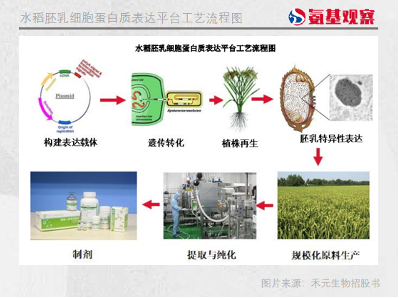 也就是说,禾元生物用水稻种子作为生物反应器,在水稻种子中特异性表达各种重组蛋白质和小分子多肽,并将其定向储存在蛋白体中,避免目标重组蛋白受细胞质蛋白酶攻击而降解,最终获得高表达的重组蛋白。