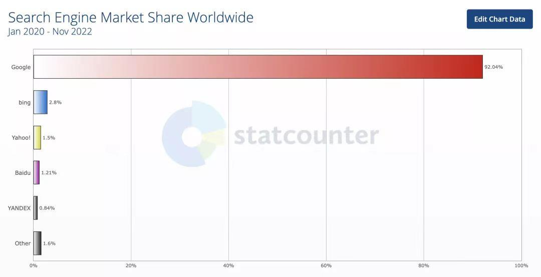 Statcounter数据显示,2020年1月-2022年11月,谷歌在全球搜索引擎市场的份额占比高达92.04%;Bing搜索位列第二,占比2.8%;百度位列第四,占比1.21%。