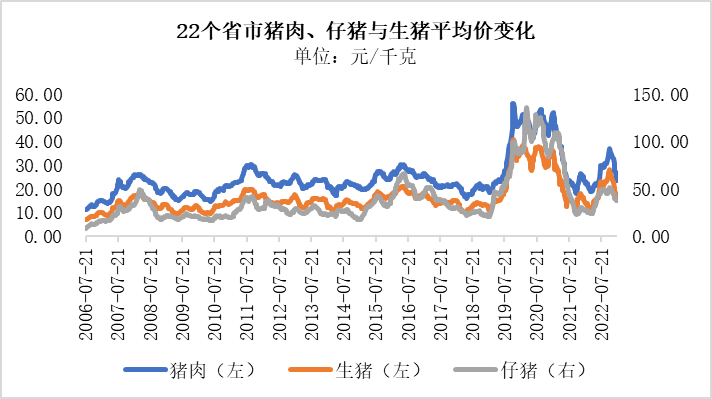 事实上,从2022年11月开始,国内22个省市的猪肉平均价格就开始出现了下跌的现象,相应地,国内仔猪与生猪的价格也基本同步下跌。