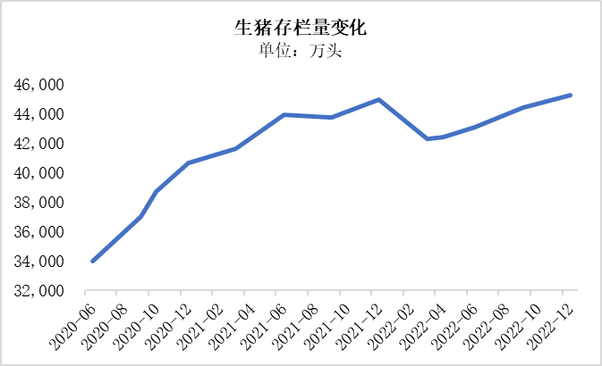 同样可以发现,2022年4月起国内生猪存栏量出现了持续增多的现象,2022年3月,国内生猪存栏量4.23亿头,2022年12月时已上涨至4.53亿头。