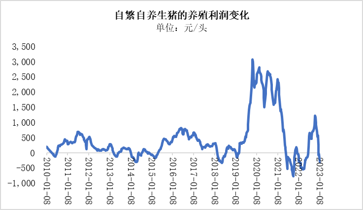 2022年7月1日,一头自繁自养生猪的养殖利润好不容易从过往的猪肉价格暴跌中恢复过来,达到了200.35元/头,但仅仅经历了4个月左右至2022年10月末超千元一头的利润后,其养殖利润就开始持续下跌,2022年12月23日就处于亏损状态,为-66.75元/头,随后一直下跌到2023年1月20日的-317.76元/头。