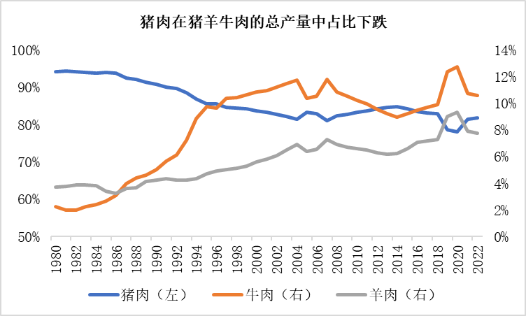 从猪肉在猪羊牛肉总产量的占比来看,虽然猪肉比例仍保持高位,但已呈现逐步下跌趋势,反而是牛羊肉产量占比整体连年上涨。