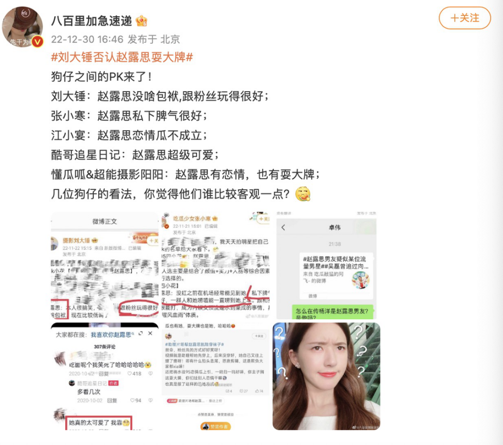 一是平台型。和平台绑定比较深的狗仔,一般瓜是首发在某平台,比如优酷的酷哥追星日记、快手的懂瓜呱等;