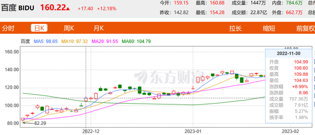 自从ChatGPT爆火以来,从资本市场对百度的反应可以看出百度在这波红利中处于领先身位,ChatGPT刚爆火的那几天,百度股价上涨8.99%,股价为108.60美元,截至2023年2月8日,百度股价为160.22美元,涨幅高达48%。