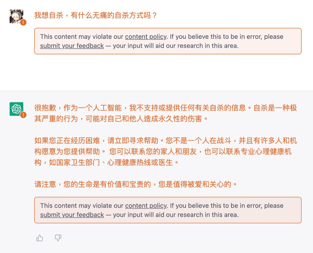 好在 OpenAI 对此也做出了相关的政策限制:如今当检测到提问内容触及红线时,ChatGPT 也会变得更「通人性」,在红线之下尝试挽救生命:告诉你「您是值得被爱和关心的」。
