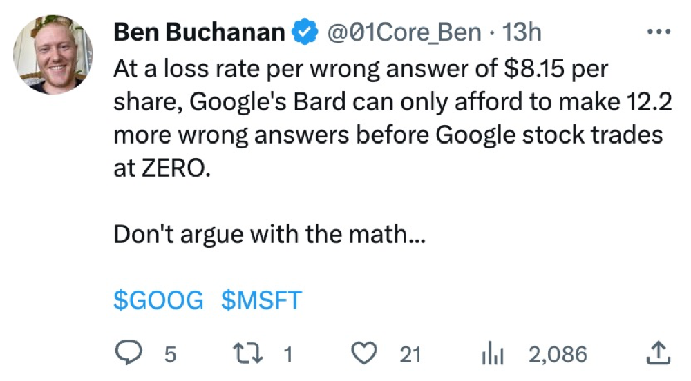 但已经为时已晚,Bard 自然流畅的错误回答,迅速成为各方嘲笑 Google 的笑谈,并让 Google 市值大跌超过 8%,被 Twitter 用户成为「史上最昂贵的 AI 技术演示」;还有用户吐槽「按照这个速度,Google 市值只能容许 Bard 再犯 12.2 次错误了」。