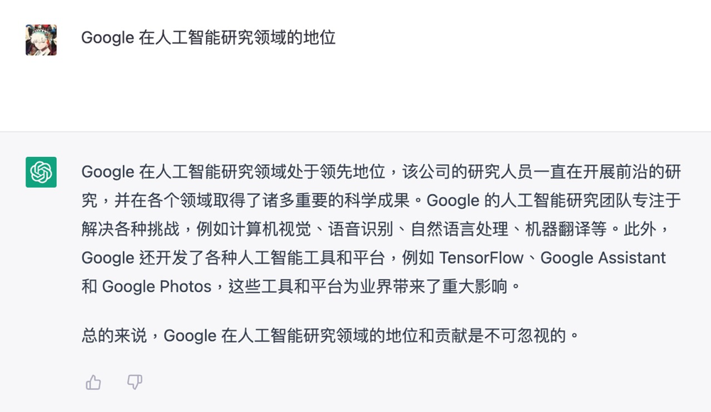 即使你向 ChatGPT 提问「Google 在人工智能研究领域的地位」,它也会公平的告诉你「Google 在人工智能研究领域的地位和贡献是不可忽视的」。