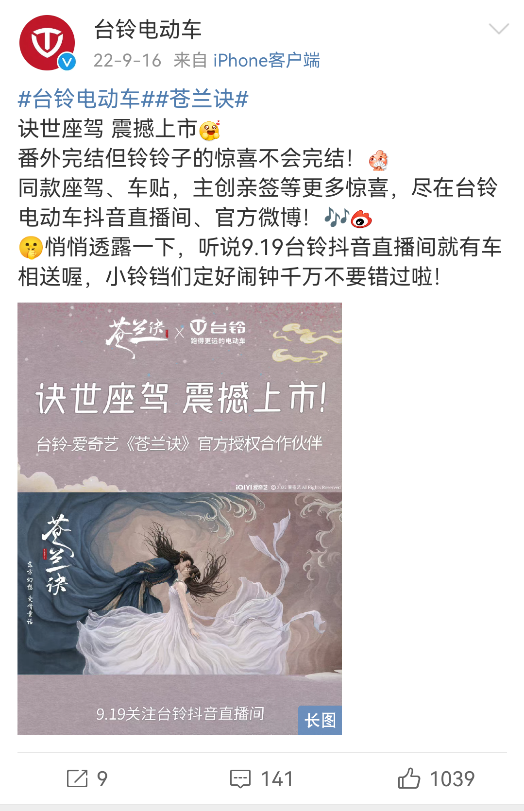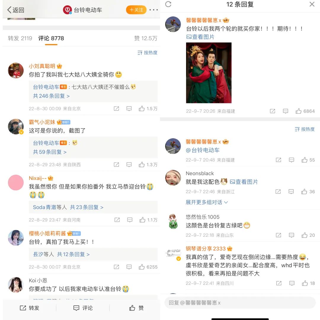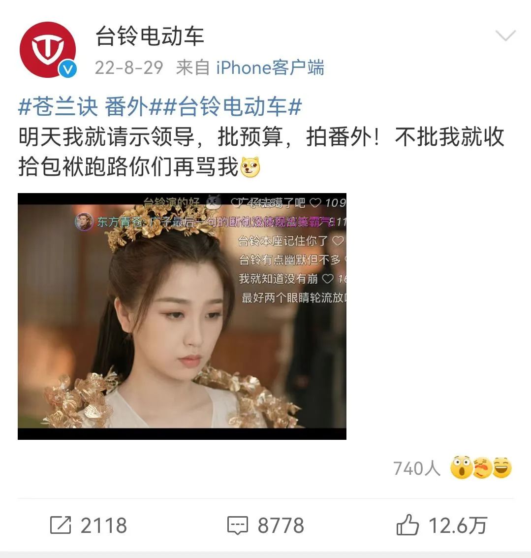 譬如台铃电动车在与《苍兰诀》合作期间,就根据剧集内容给自己打造了“头等苍人”、“诀世座驾”等代表名词,并在微博引发用户纷纷跟风玩梗,品牌名称也刻在了观众的脑海中。
