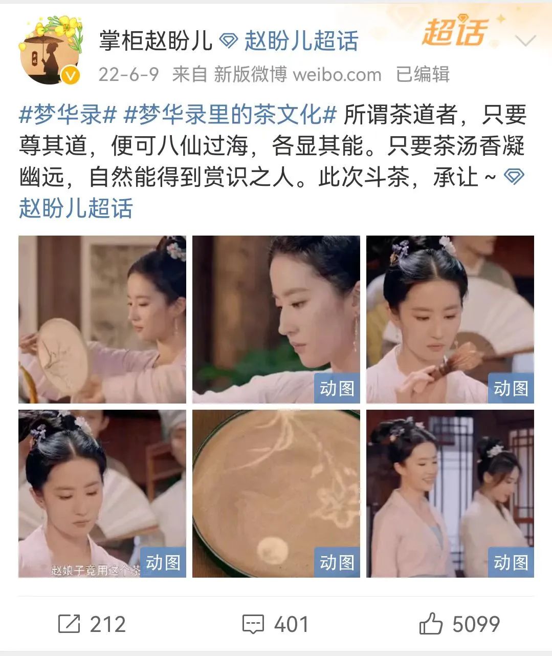 去年《梦华录》在热播期间,#梦华录 文化自信#、#梦华录里的茶文化#相继登上了热搜,引起了大家对中国茶文化的讨论,剧中人物@掌柜赵盼儿 也在微博上与网友探讨茶与茶道。