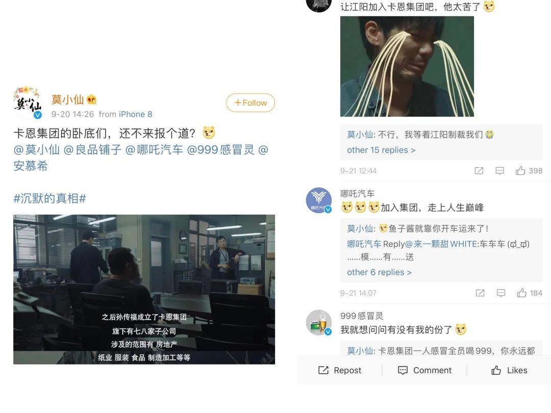 其中被批评最多的“莫小仙”,快速发博回应:结合影视剧内容,用轻松幽默的语气表达了对于事件的态度,并@了《沉默的真相》的其他合作品牌。